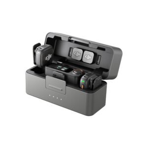 El estuche de carga sostiene ingeniosamente dos transmisores y un receptor. Cada transmisor encaja en el interior con el antiviento y el imán o el clip magnético acoplado, sin necesidad de quitarlos. Cuando los transmisores se almacenan con los clips acoplados, la tapa también tiene espacio para los imanes y el cable adaptador de audio con bloqueo, para que todo se mantenga organizado y listo para usar.